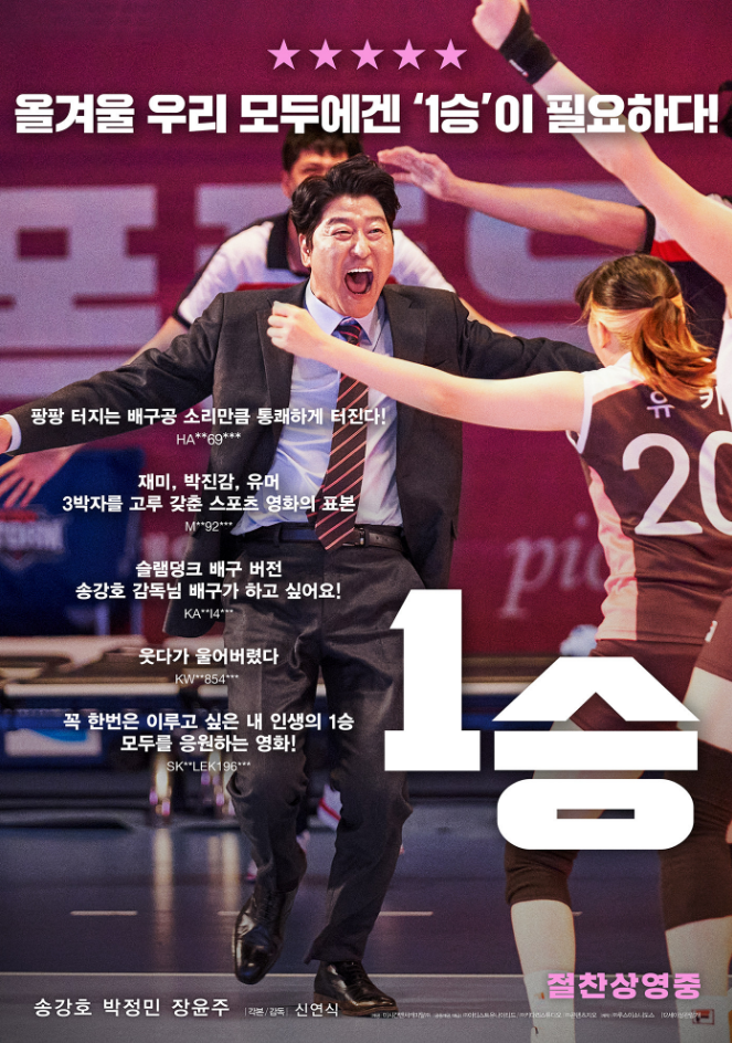 영화 **<1승>**은 신연식 감독이 연출한 한국 최초의 배구 영화로, 송강호, 박정민, 장윤주 등의 배우들이 출연합니다. 이 작품은 승리를 경험해보지 못한 감독과 승리에 무관심한 구단주, 그리고 승리의 방법을 모르는 선수들이 모여 첫 승리를 위해 도전하는 이야기를 담고 있습니다.
