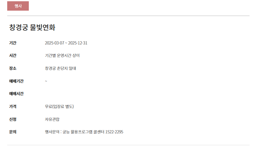 | 행사기간 | 2025 . 3. 7.(금) ~ 12 . 31.(수) *휴궁일(월) 제외 |